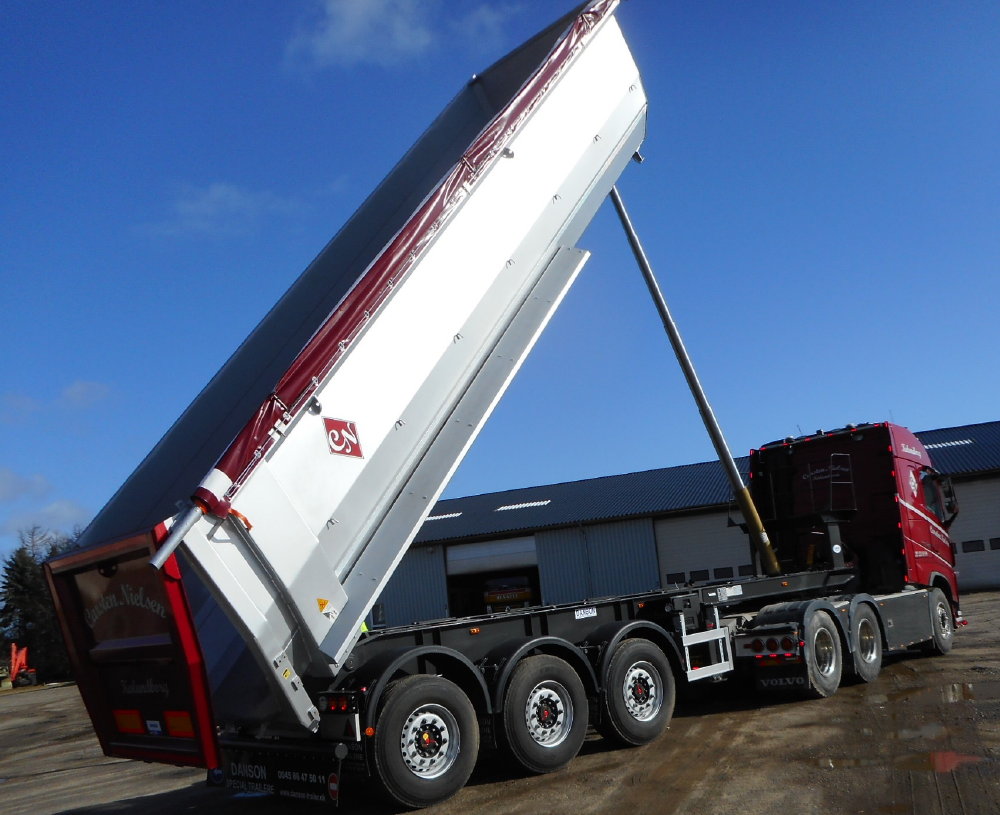 Hardox tipkasse med 4 mm sider og 5 mm bund. Tophængt bagklap med kraftig kantramme og stærkt lukkesystem med 2 fingre i bunden. Chauffør venlig gangbro til når rulle presenningen i god slidstærk kvalitet skal rulles ud - kan også leveres med automat presenning efter ønske mod merpris.