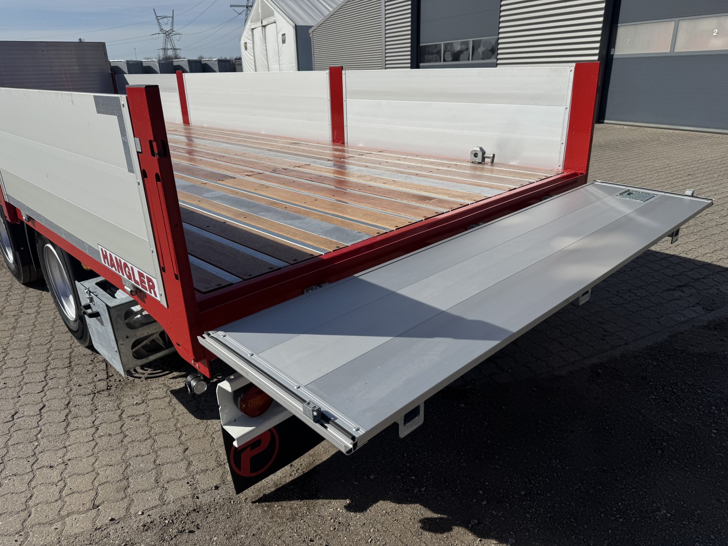 Her er der tale om en HANGLER kærre med 600mm aluminium-sider, som er udstyret med løse 12-tons alu-ramper. Kærren er forsynet med BPW aksler med tromlebremser, og den har en liftaksel på både aksel 1 og aksel 3. Trækstangen er forskydelig med mulighed for at låse den for hver 100mm, og dens længde kan justeres fra 1.800mm til 2.400mm.
