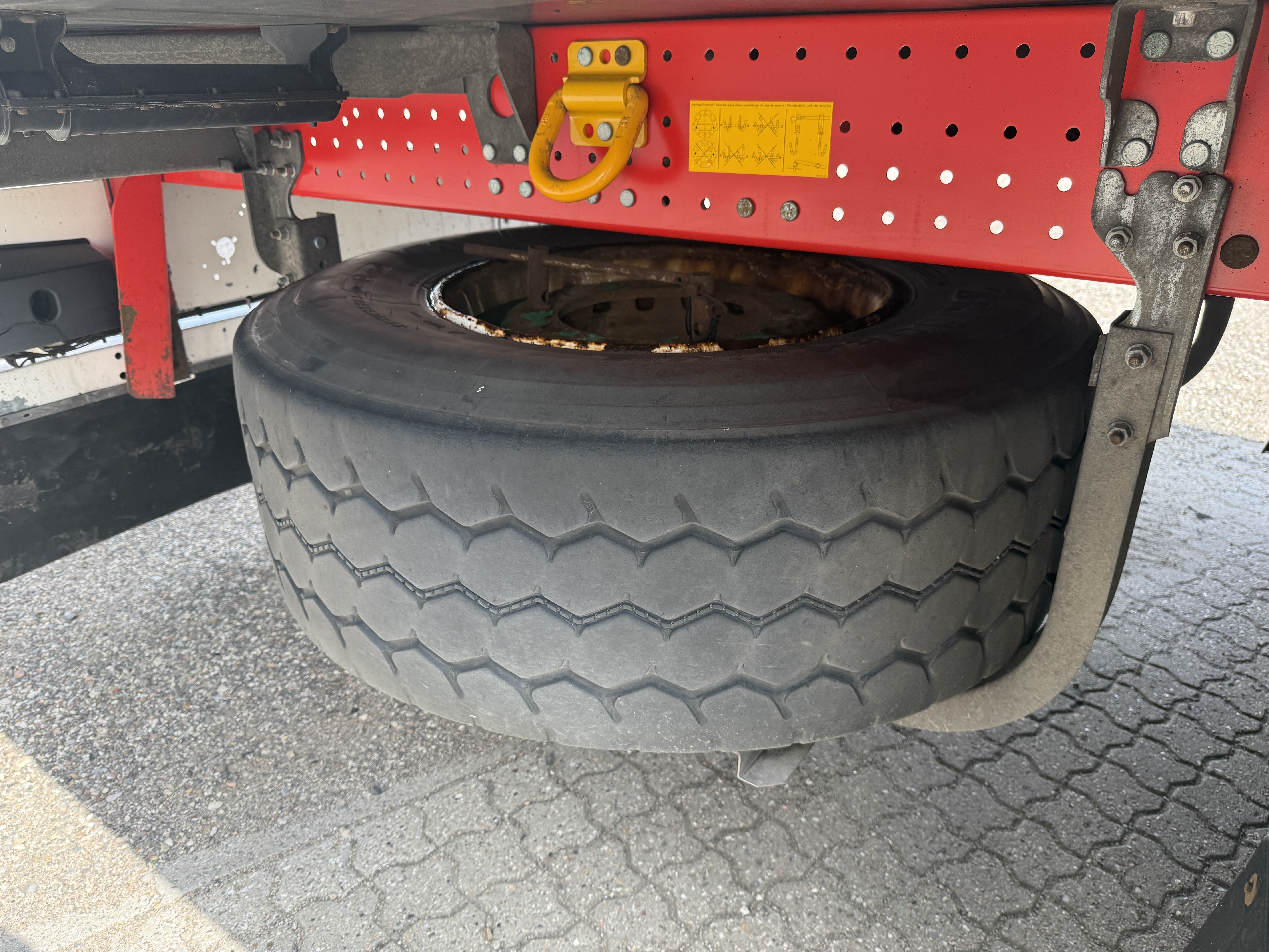 Indvendigt er den udstyret med langsgående surringsrækker, og der er monteret to pallekasser samt et reservehjul udvendigt.