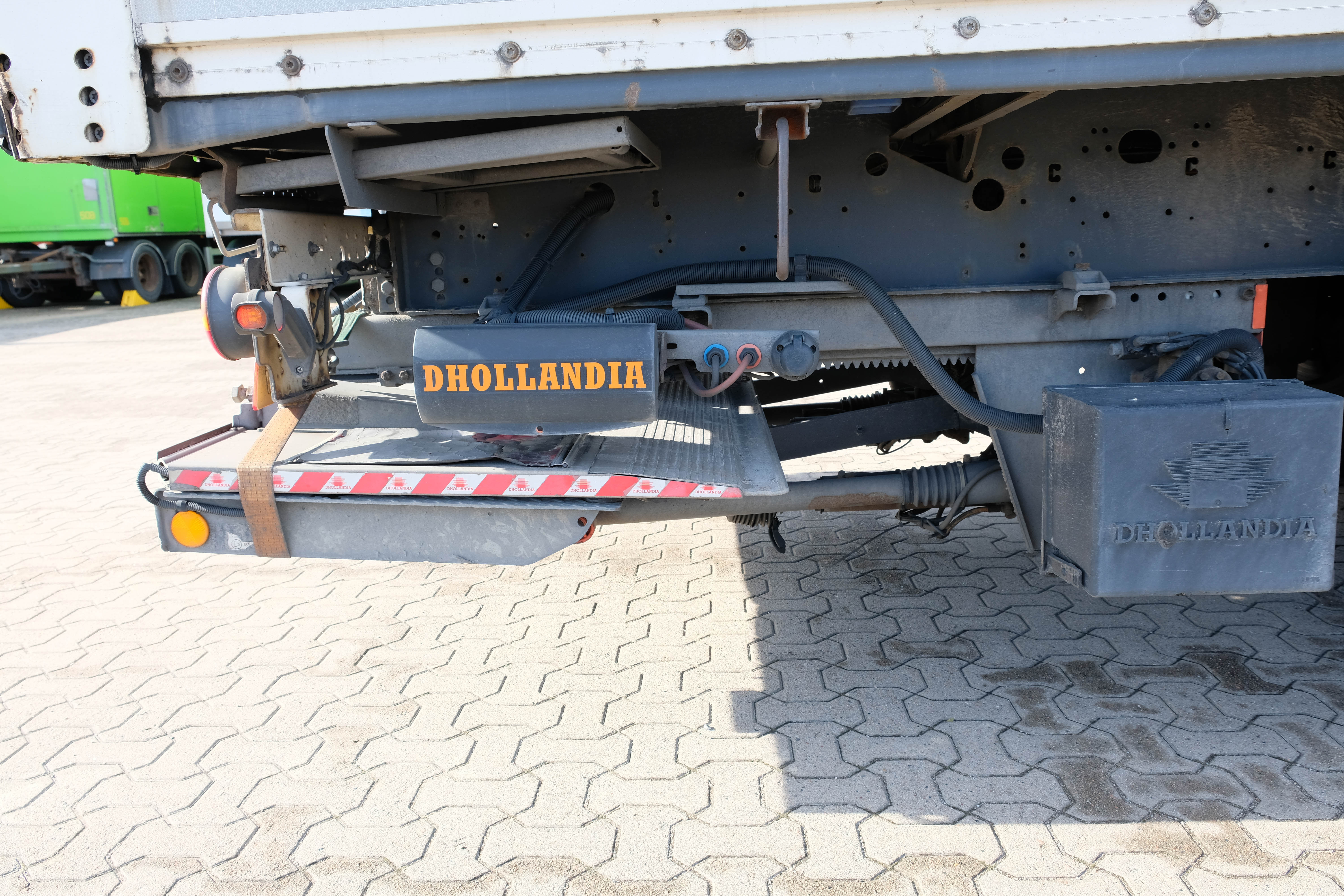 Her er en Krone 3-aks bokstrailer fra marts 2018. Den er udstyret med en Dhollandia folde-/slædelift. Traileren har finner bund og surringsrækker.