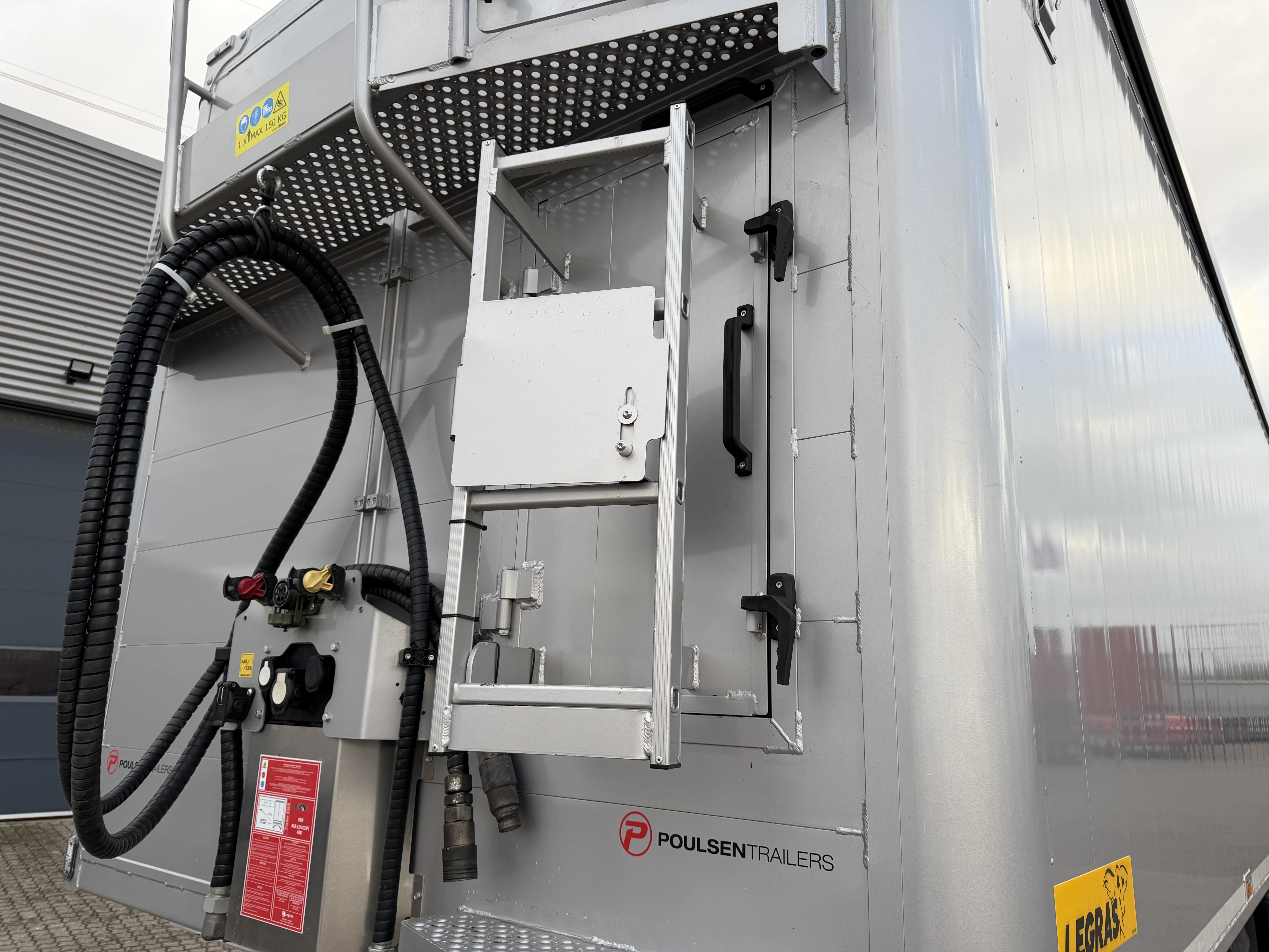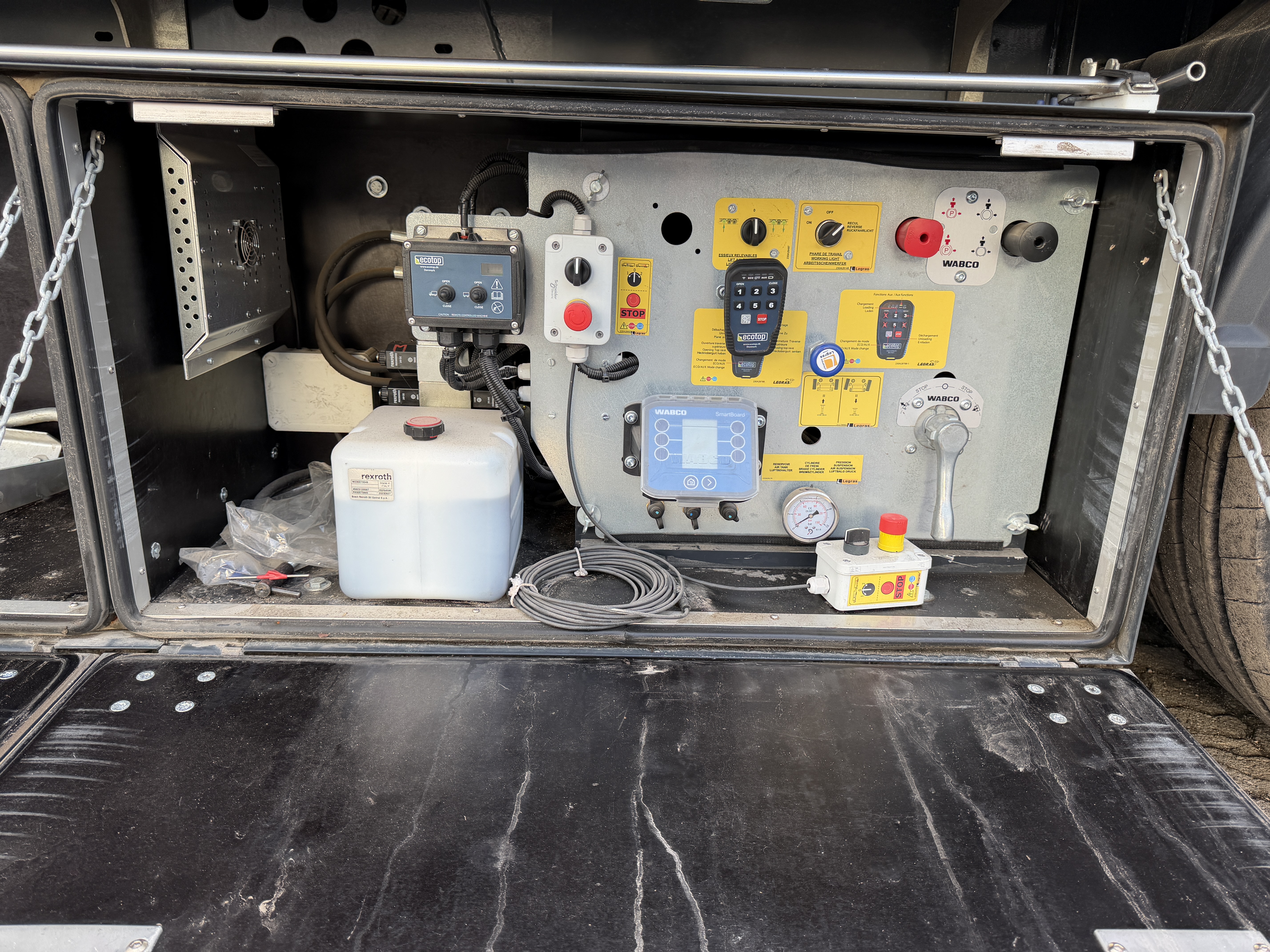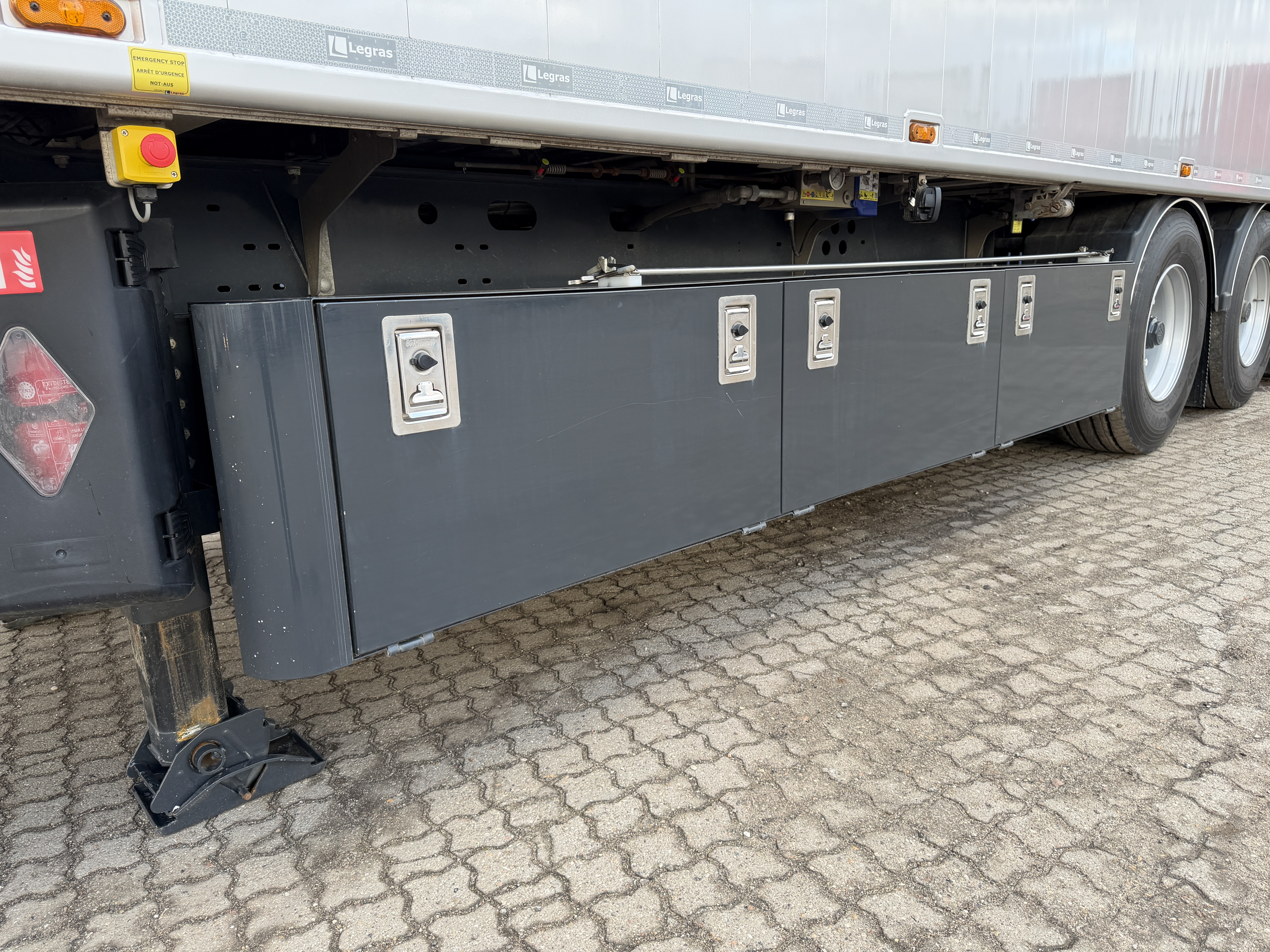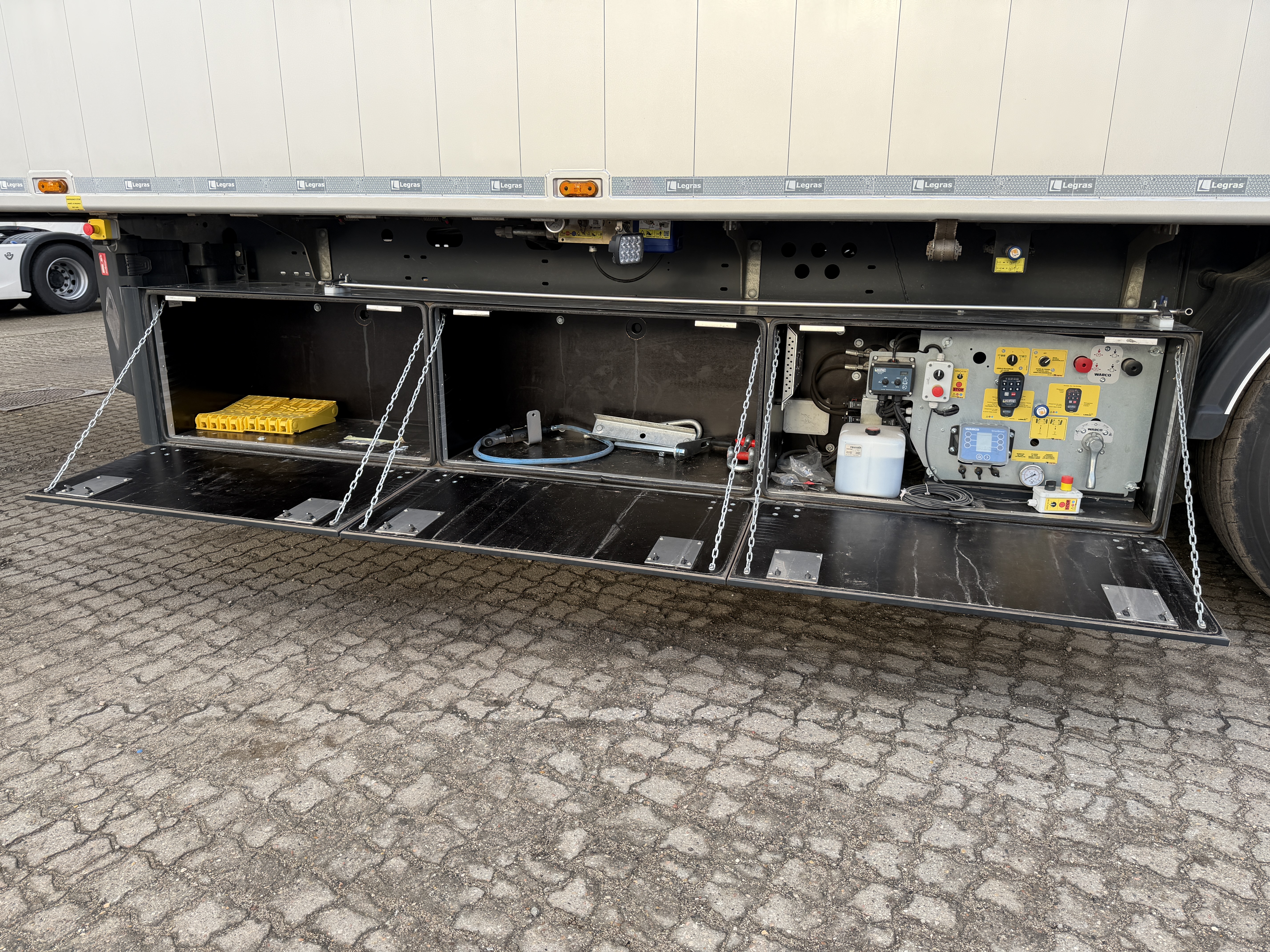 Monteret er også sideskørter samt BoxNordic værktøjsskab i venstre side, med indbyggede betjeningsventiler og varme i den bagerste del af kassen, hvor disse findes. Udvendigt er der placeret betjeningsventil til bagdørslås.