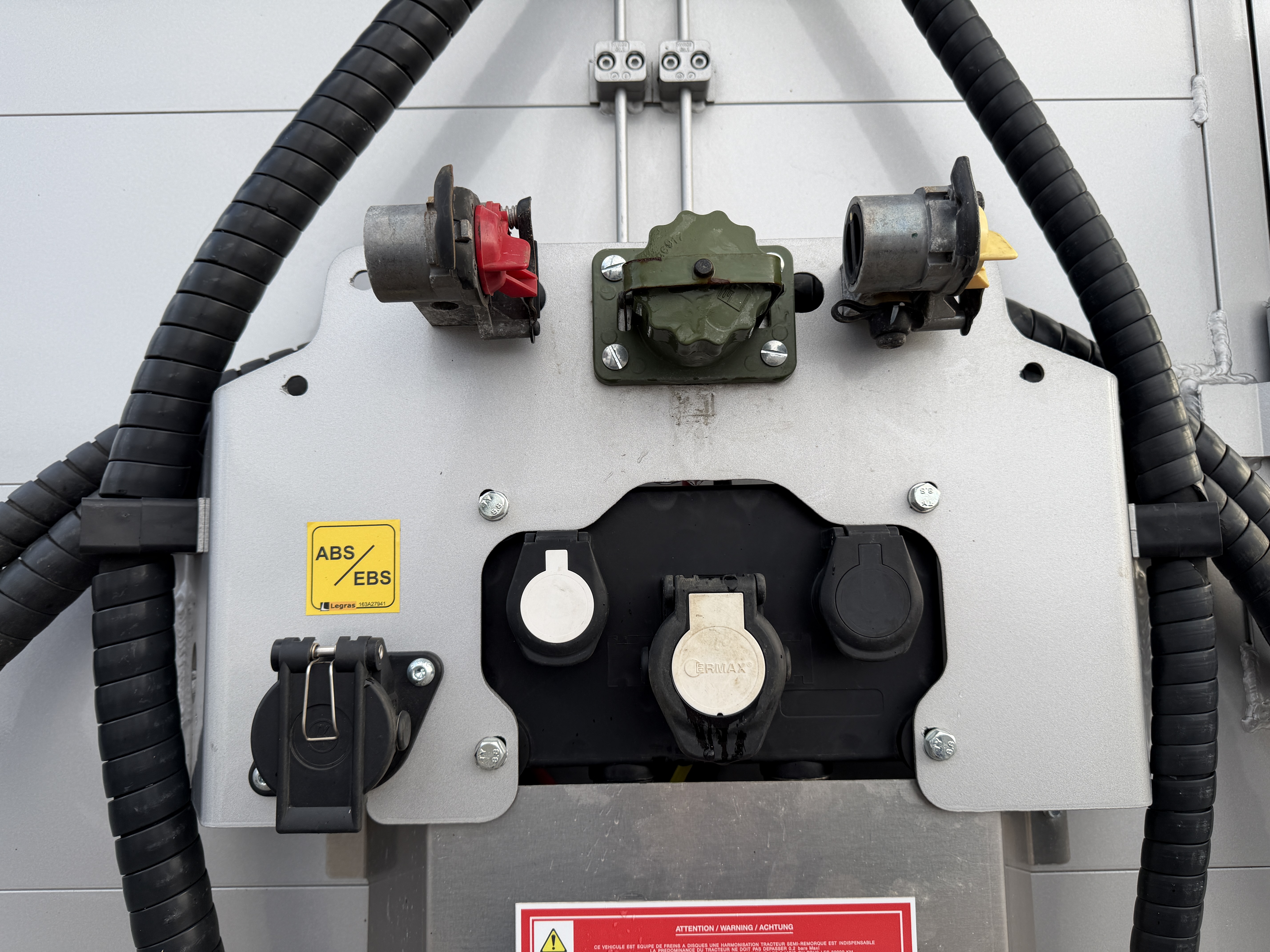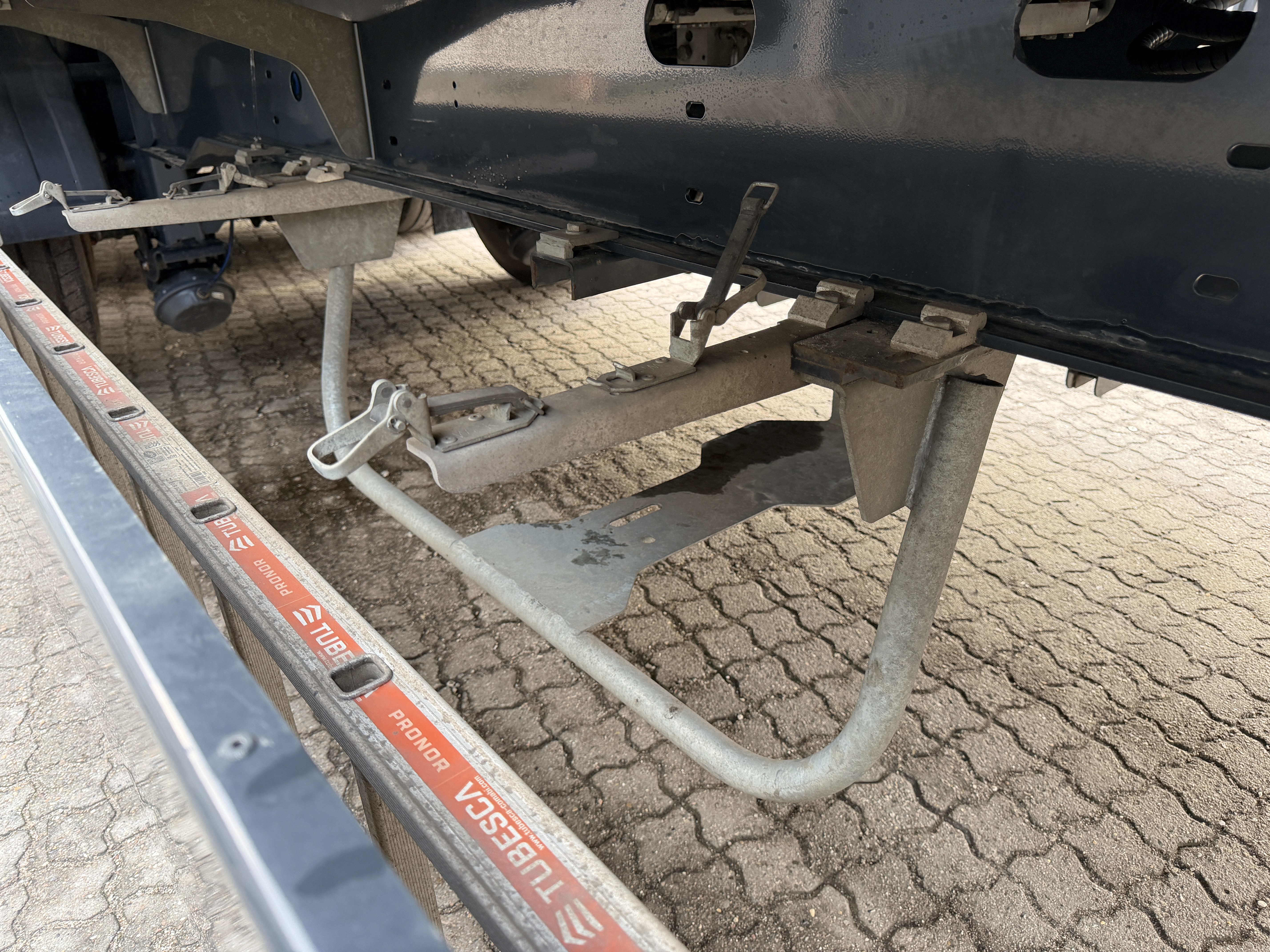 Bagtil findes to trækøjer, samt på siden kost-/skovlbeslag, én løs alu-stige samt reservehjulsophæng.