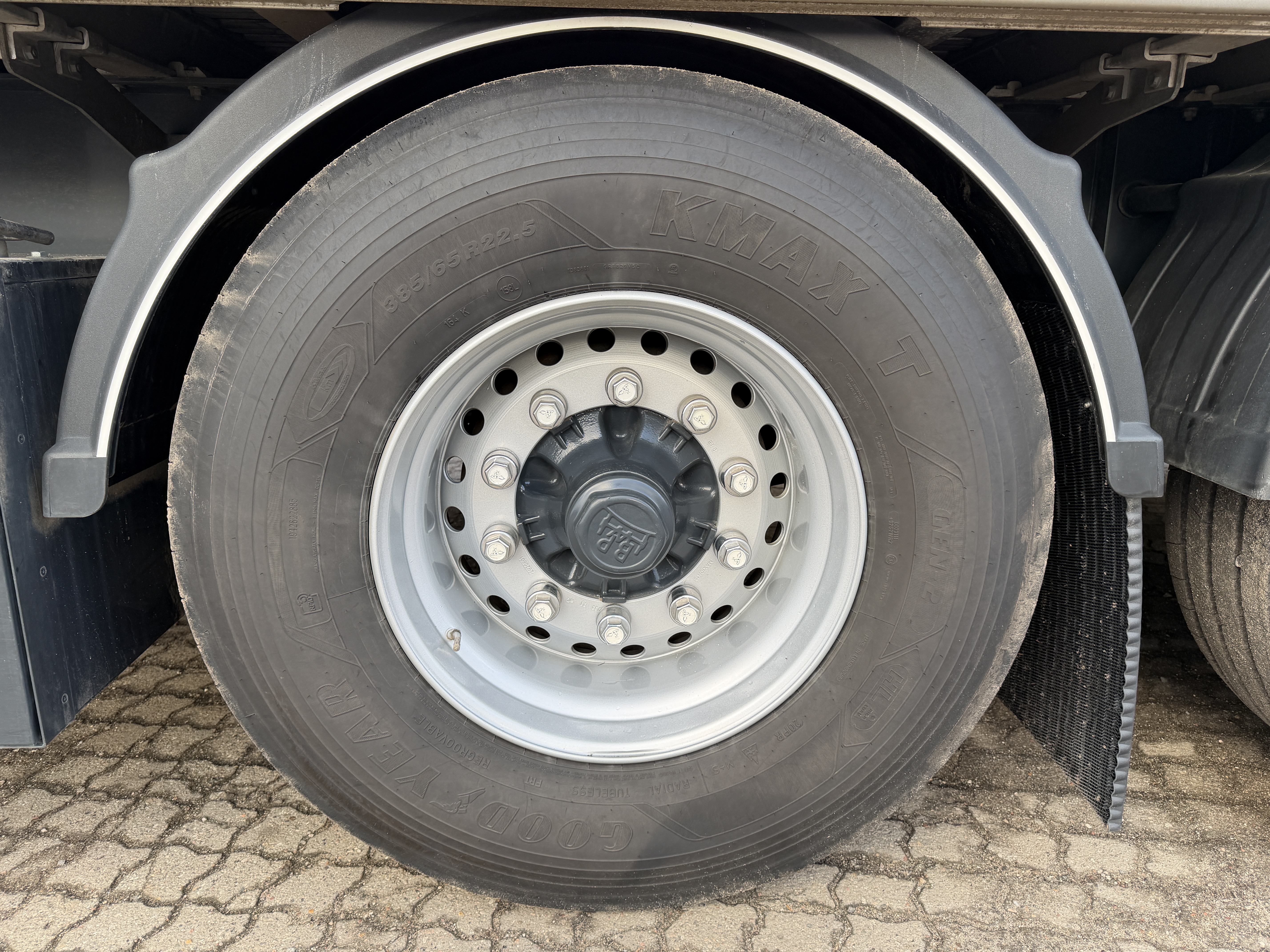 Den kører på 385/65 R22,5” dæk monteret på metalliserede og autolakerede stålfælge.