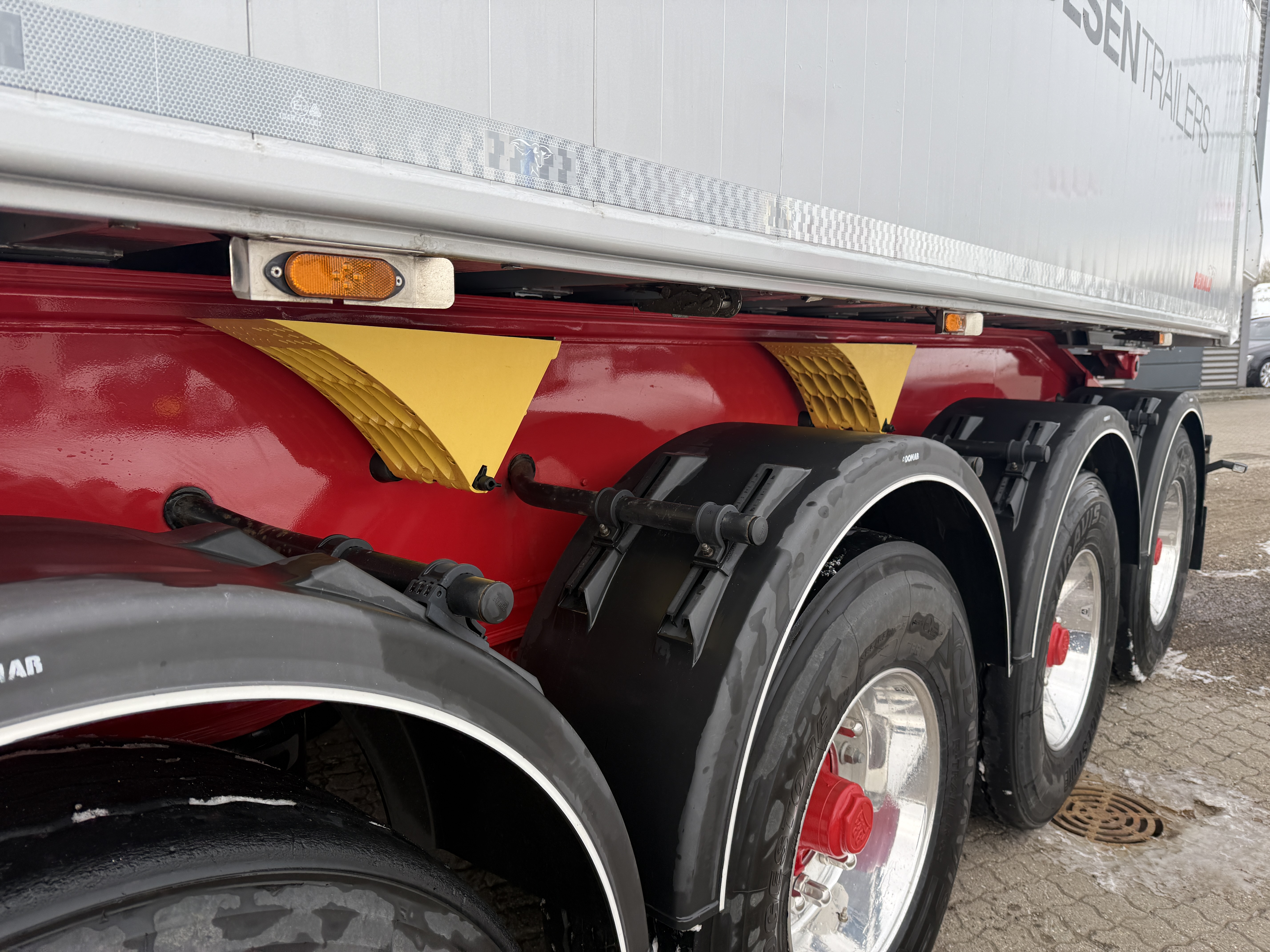 Den har BPW‑aksler med tromlebremser og har løft på både aksel 1 og 3 samt medstyring på aksel 4. Traileren står på Alcoa DuraBright alufælge og har en kraftig 8 mm bundplade i kassen. Den er udstyret med manuel rullepresenning og har ekstra bred chassisramme for bedre stabilitet.