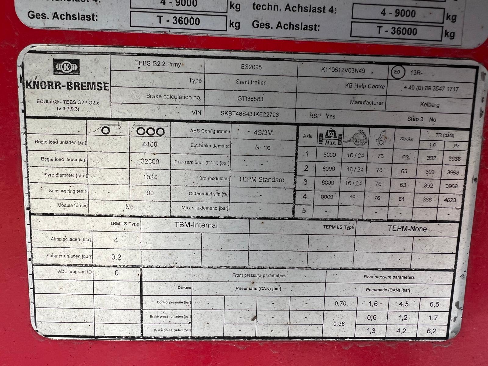 Denne Kel‑Berg 4‑aks tiptrailer er opbygget i Hardox og har en kapacitet på ca. 72 m³, hvilket gør den velegnet til transport af store mængder materiale. Traileren er fuld luftaffjedret og kører på SAF‑aksler med skivebremser. Første aksel er med lift, og fjerde aksel er medstyrende.