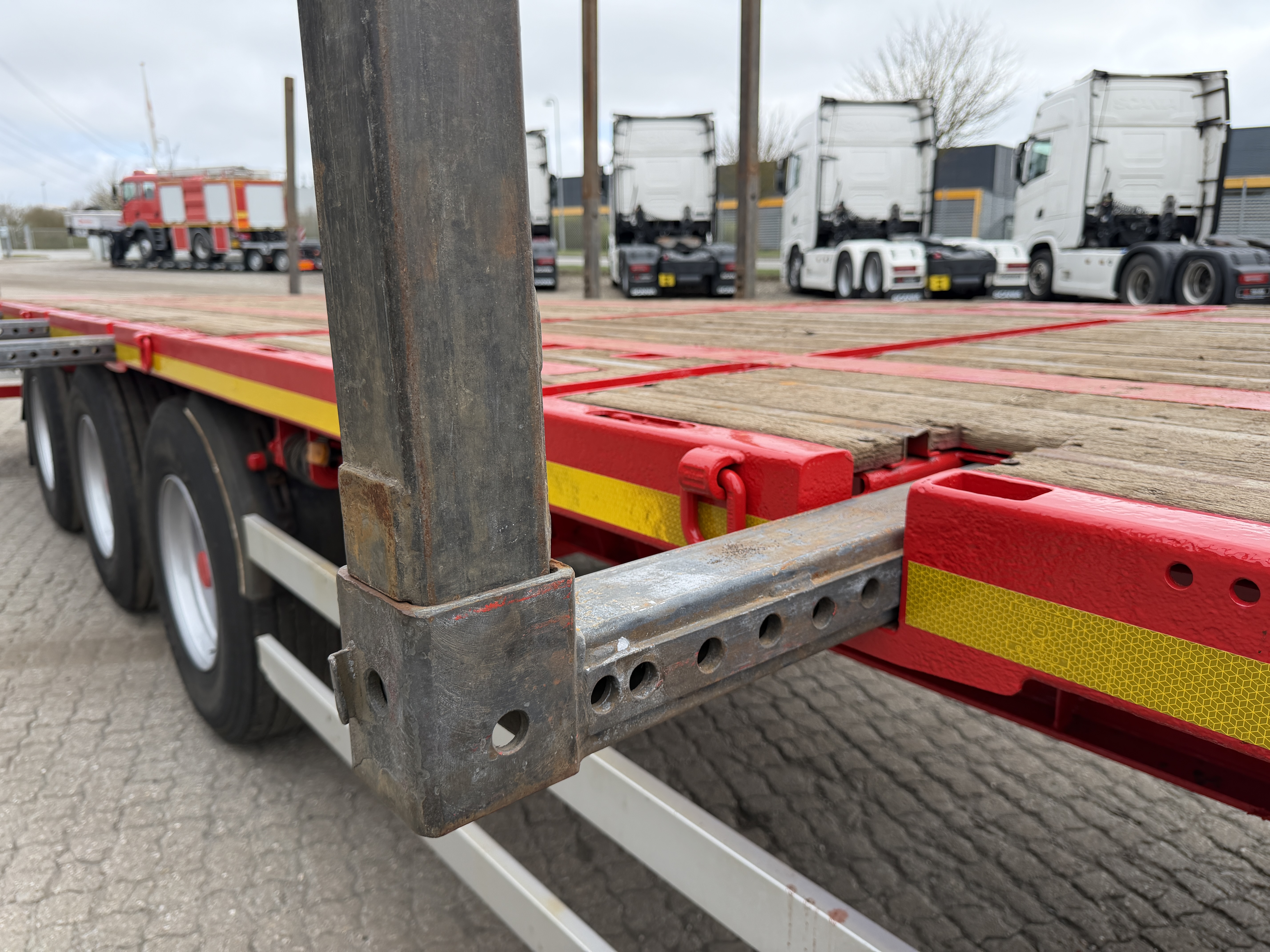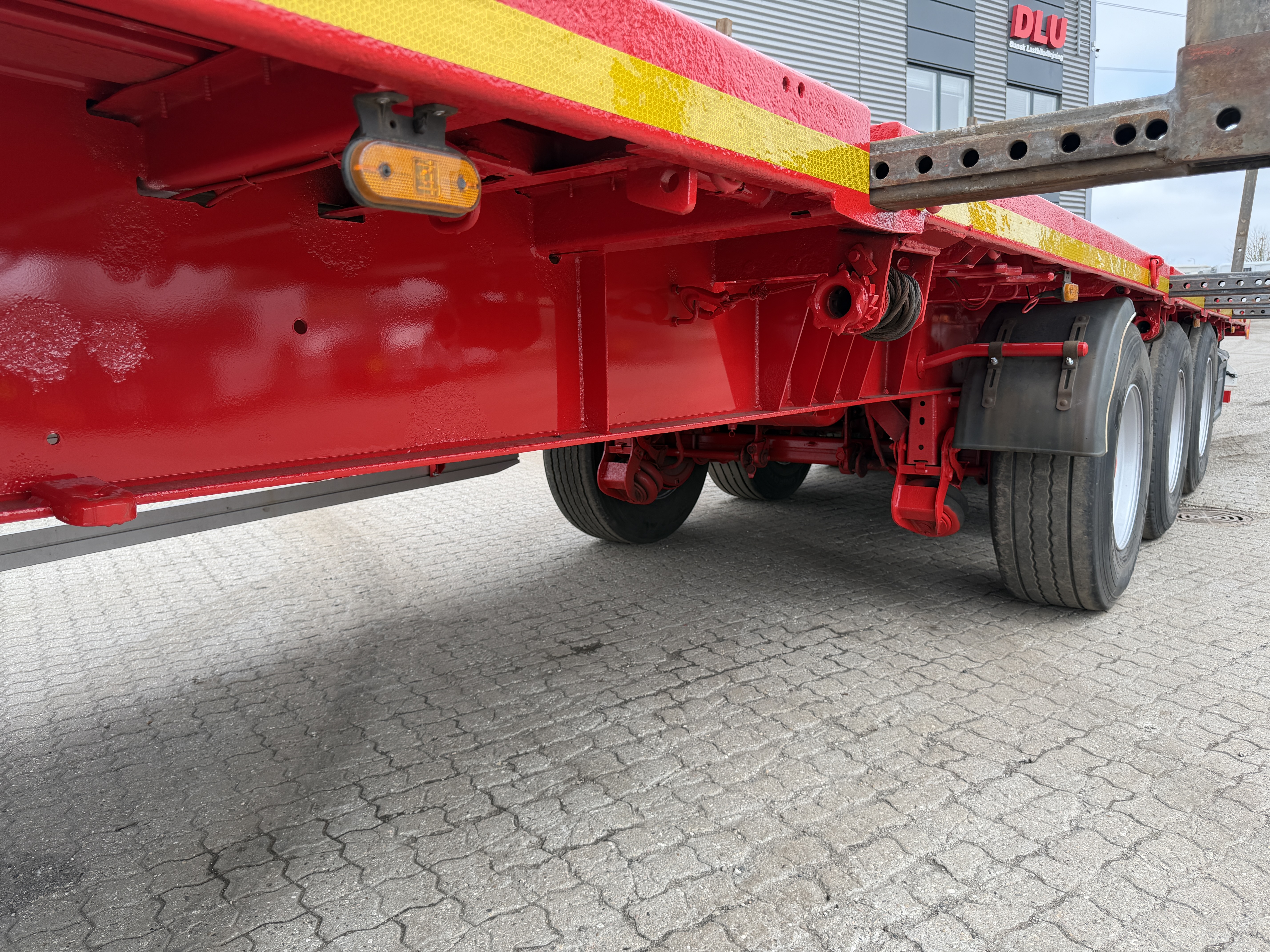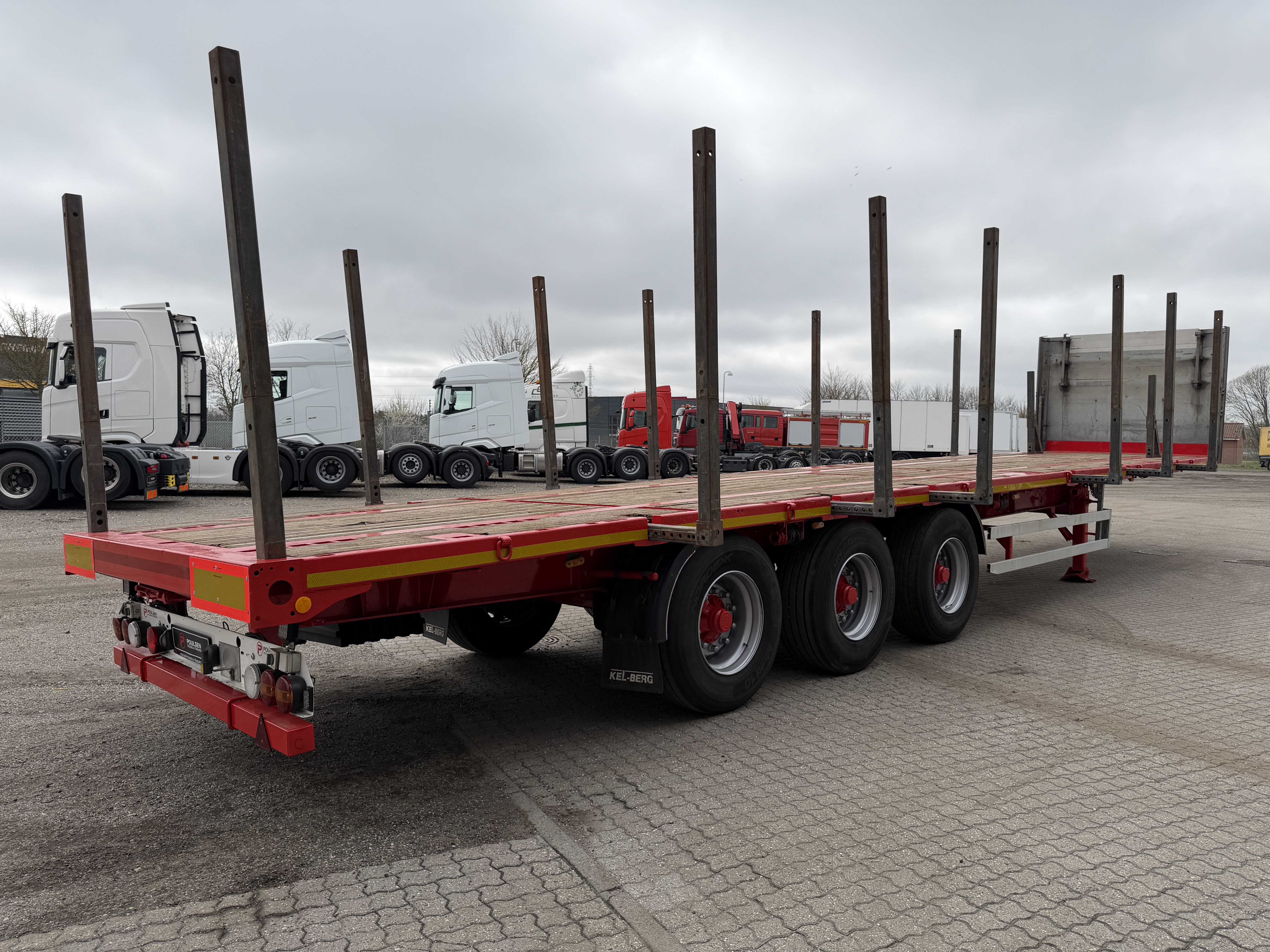 KEL-BERG 3-aks åben ligeud trailer med udtræks-kæpstokke og containerlåse. Traileren er udstyret med BPW-aksler med tromlebremser samt liftaksel på første aksel.