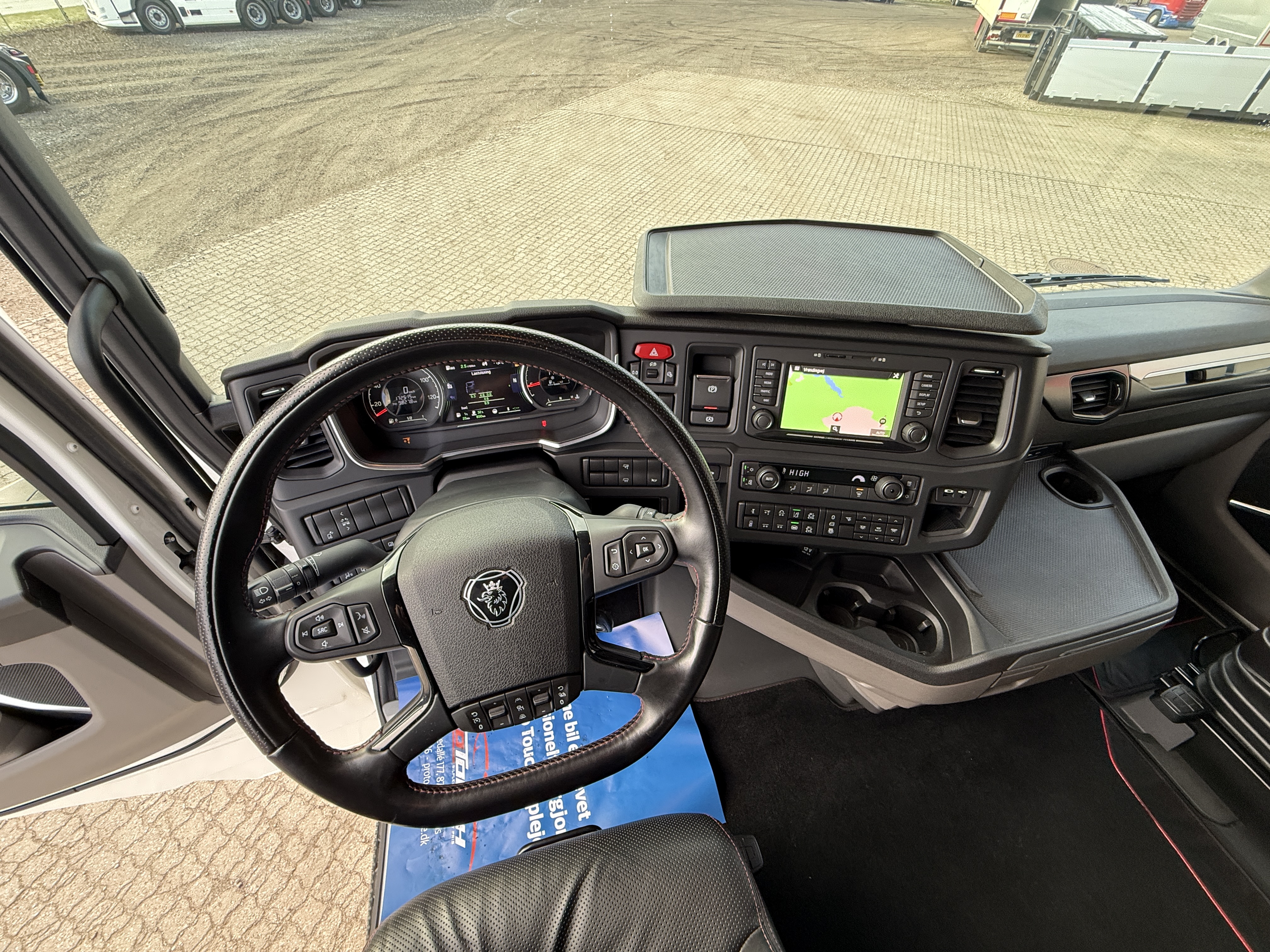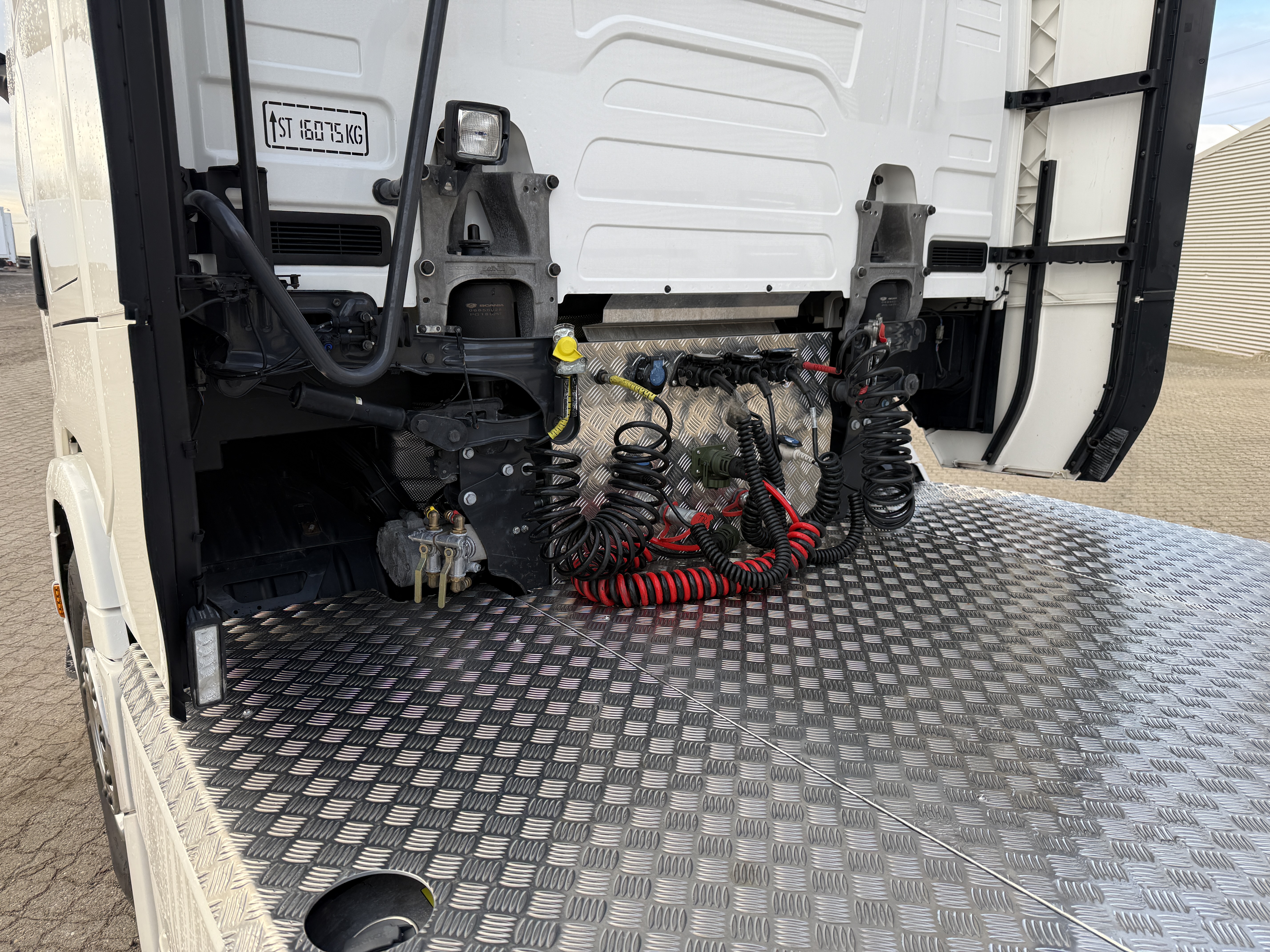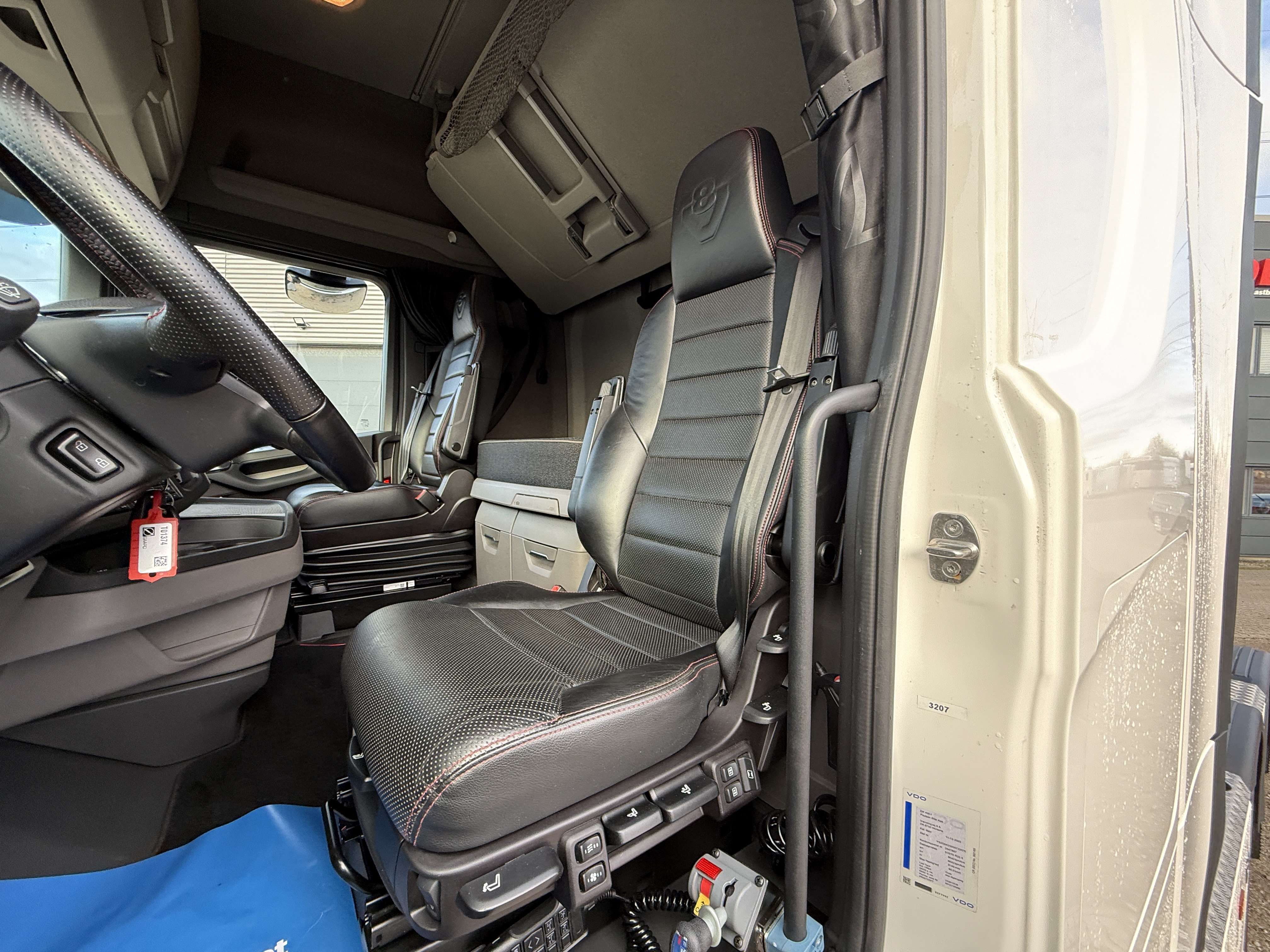 Trækkeren har flere tekniske og komfortmæssige funktioner, herunder Scania aircooler, automatisk klimaanlæg, aircondition og et køleskab. Kabinen er udstyret med lædersæder, og førersædet har både varme og ventilation. Navigationssystemet er integreret, og der er installeret adaptiv fartpilot, ACC, sporassistent og lastindikator.