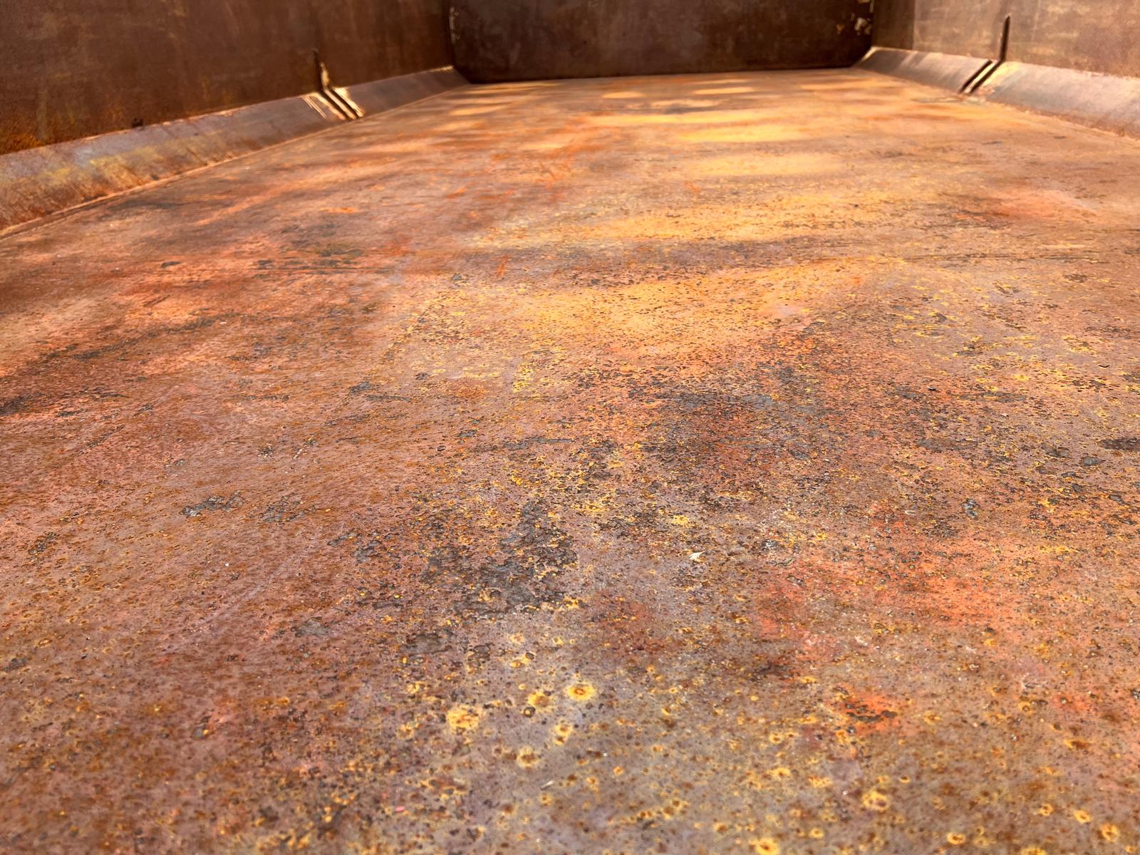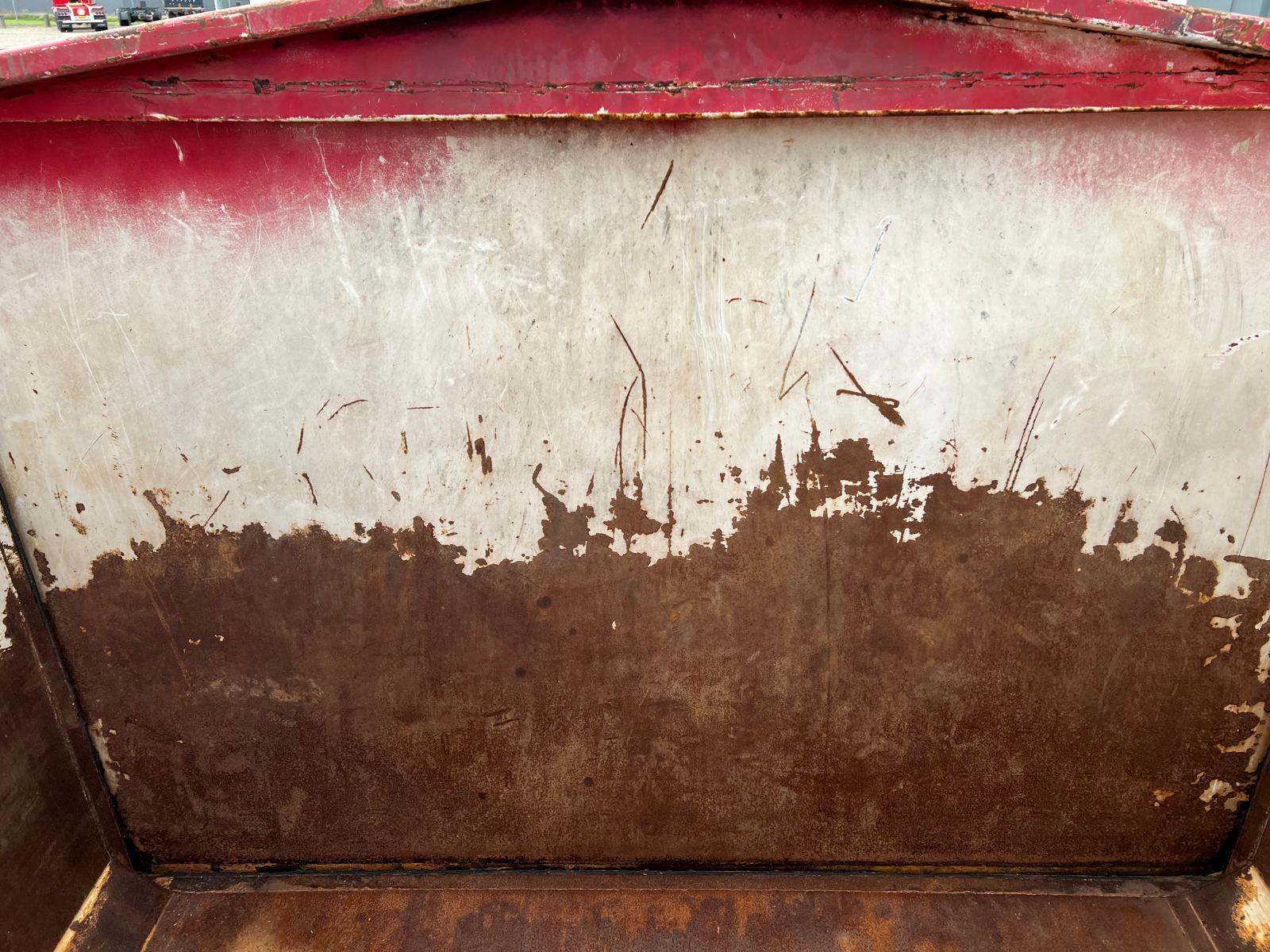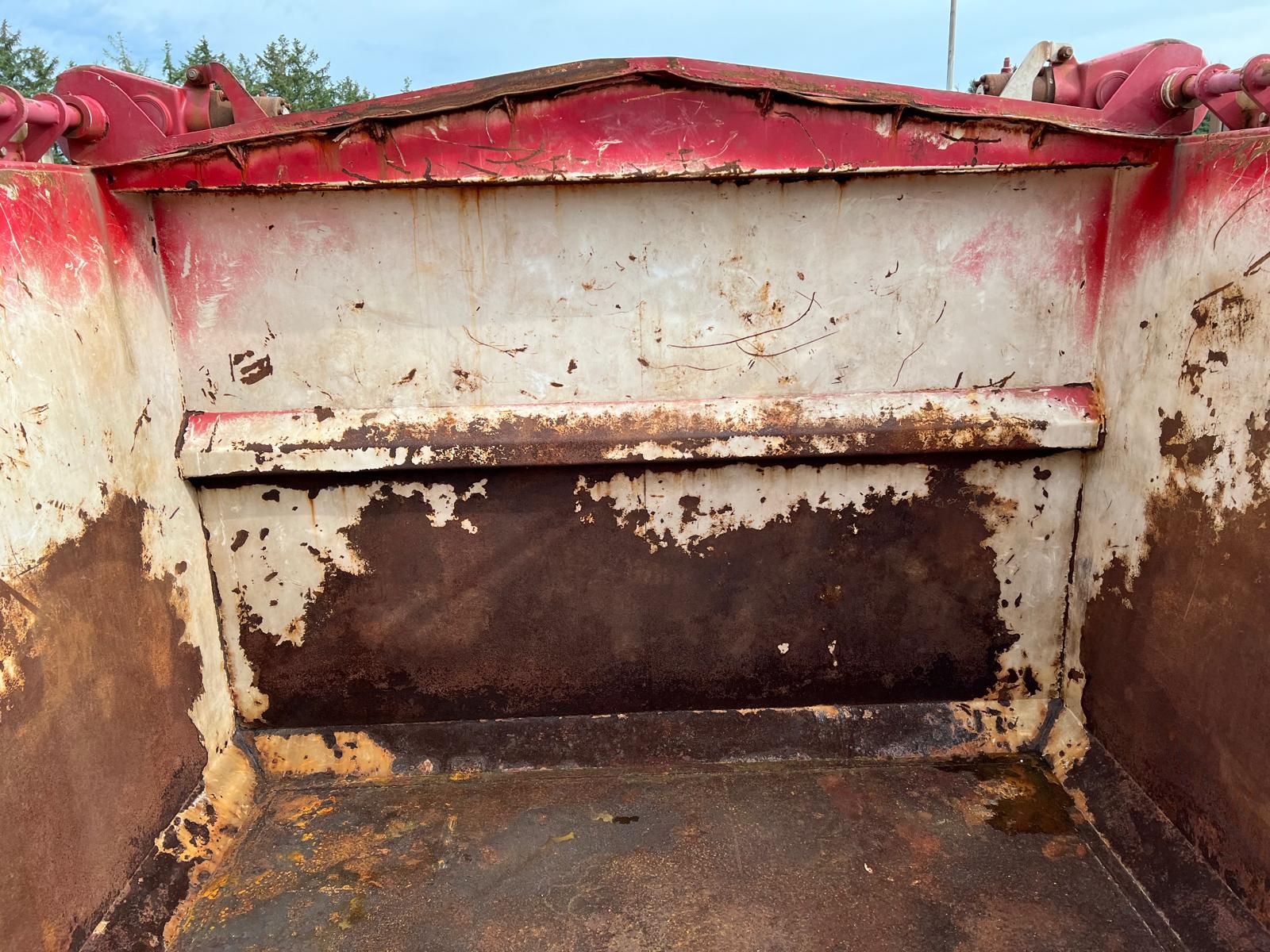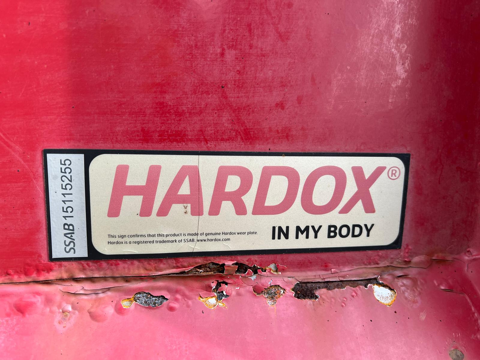 Tophængt væske tæt bagsmæk med 1 x spindler i hver side - 2-delt hydraulisk alu-låg, der kører via. pendel udtag - Hardox in my body klistermærke påsat - Ståltype + tykkelse ukendt