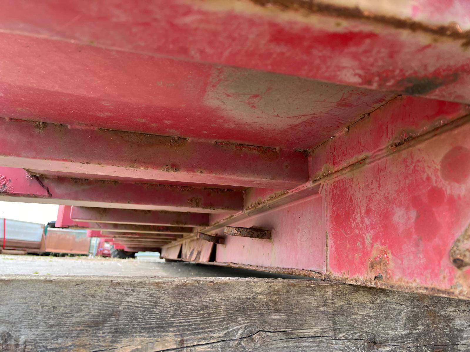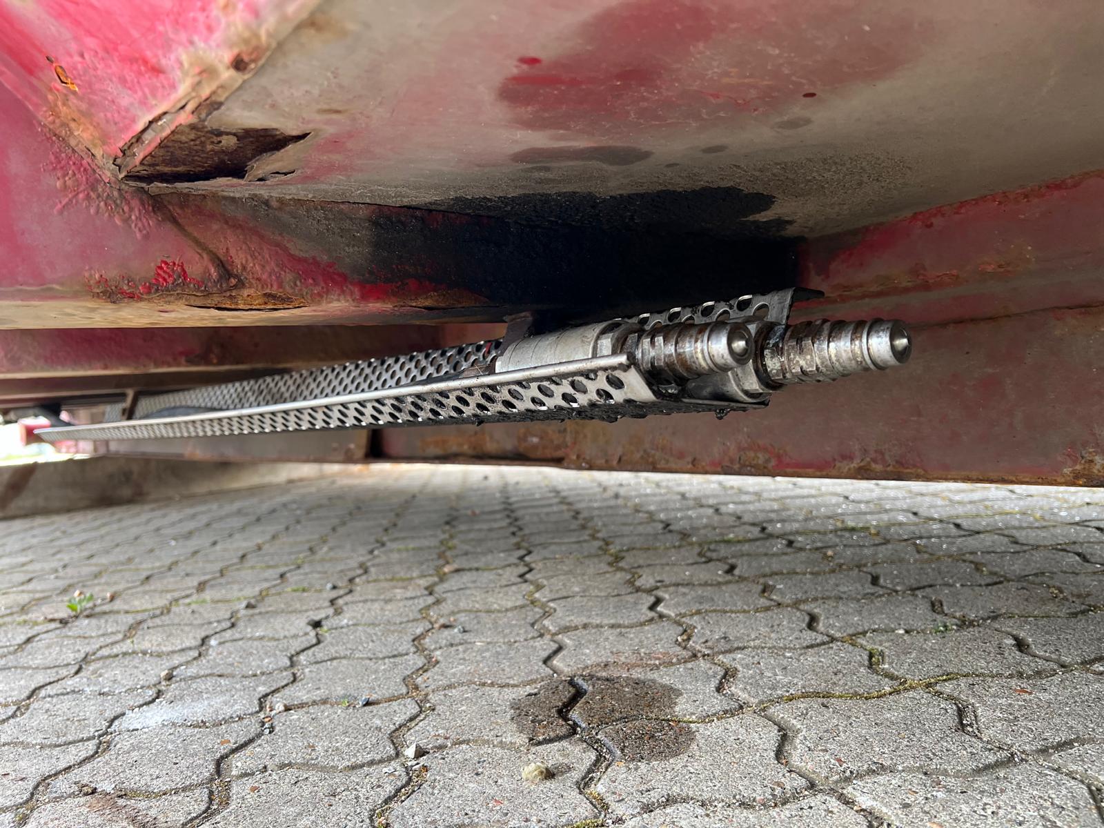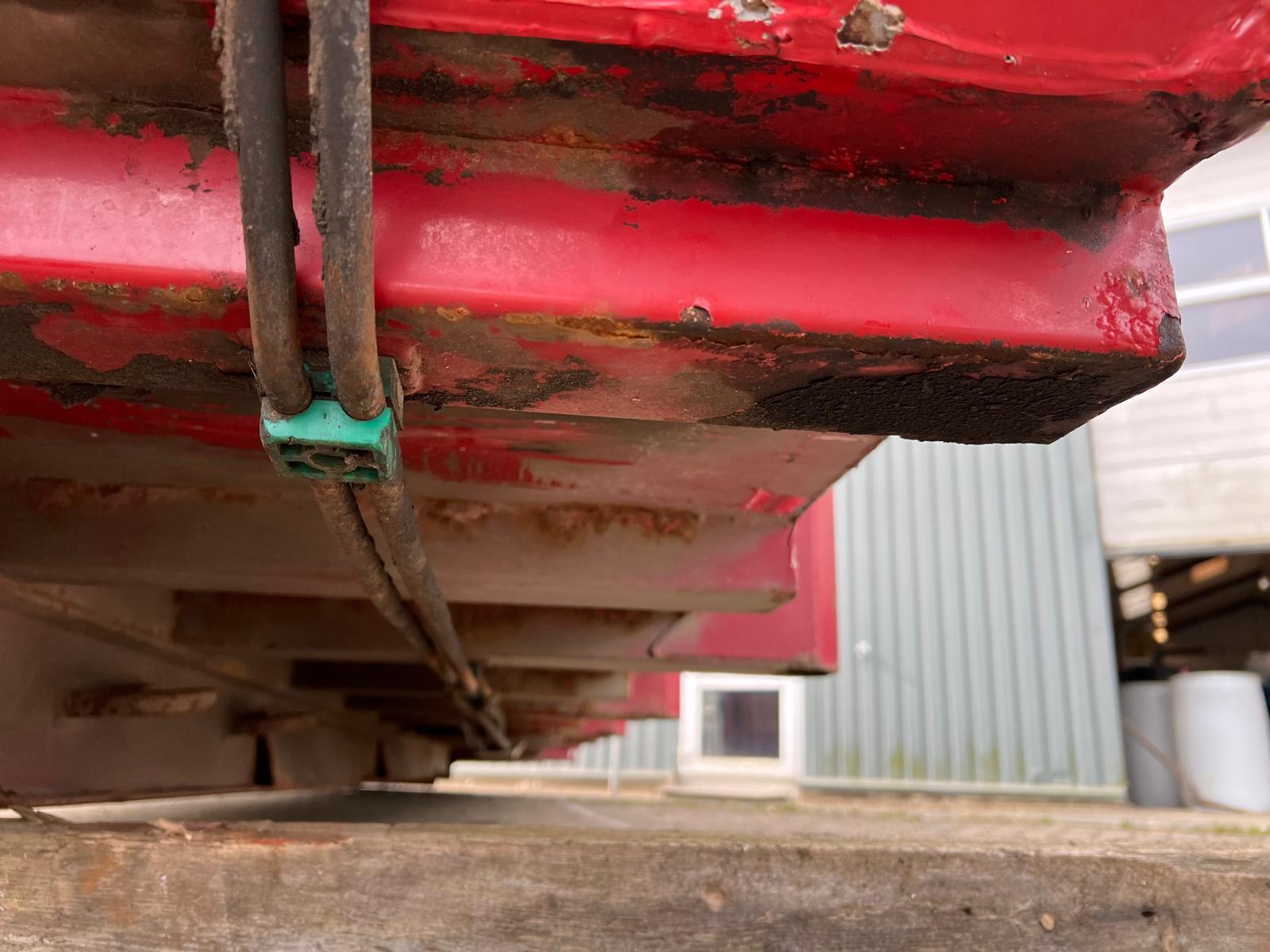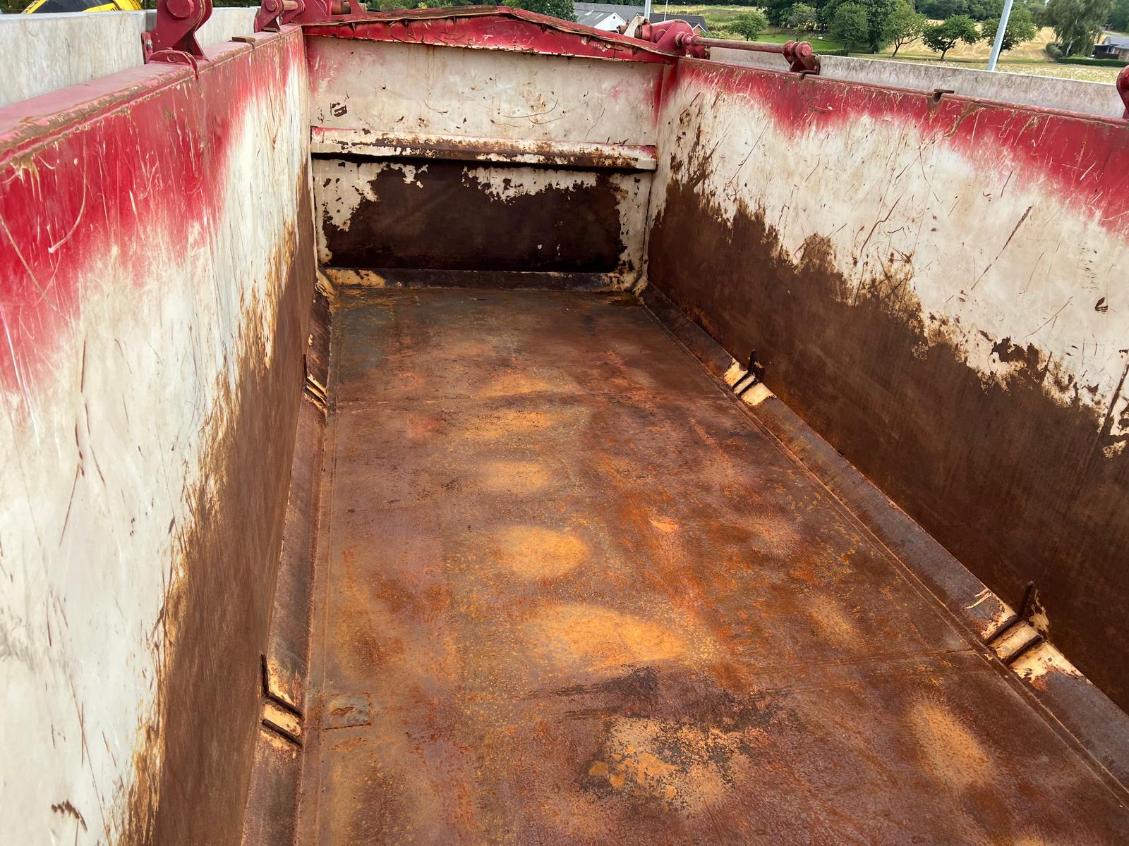 Tophængt væske tæt bagsmæk med 1 x spindler i hver side - 2-delt hydraulisk alu-låg, der kører via. pendel udtag - Hardox in my body klistermærke påsat - Ståltype + tykkelse ukendt