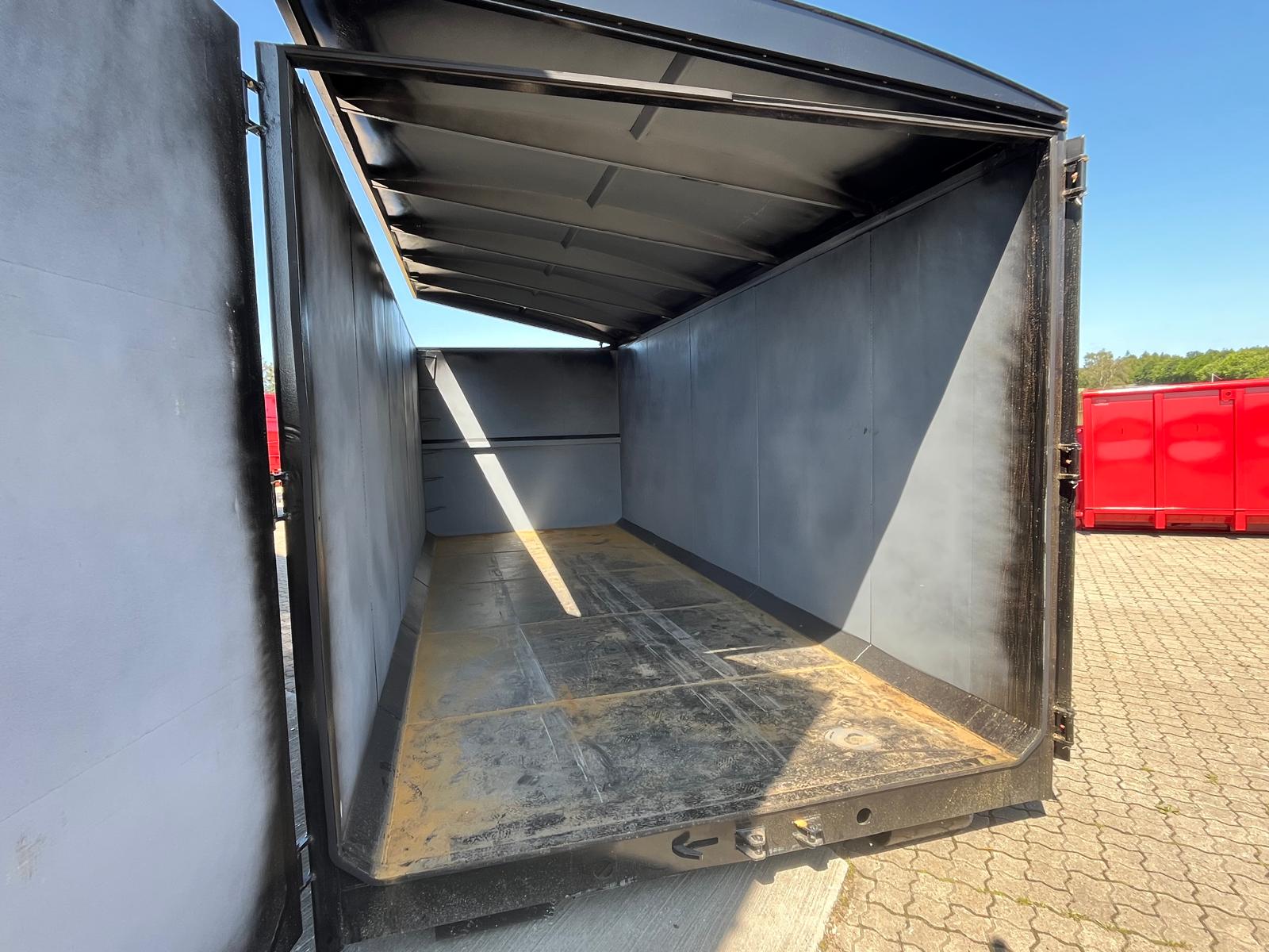 Opbygget med følgende indv. mål: L6000 x B2350 x H2050 mm - 5 mm bund / 3 mm sider / 2 mm låg - Sidehængte bagdøre m/udløserhåndtag i højre side