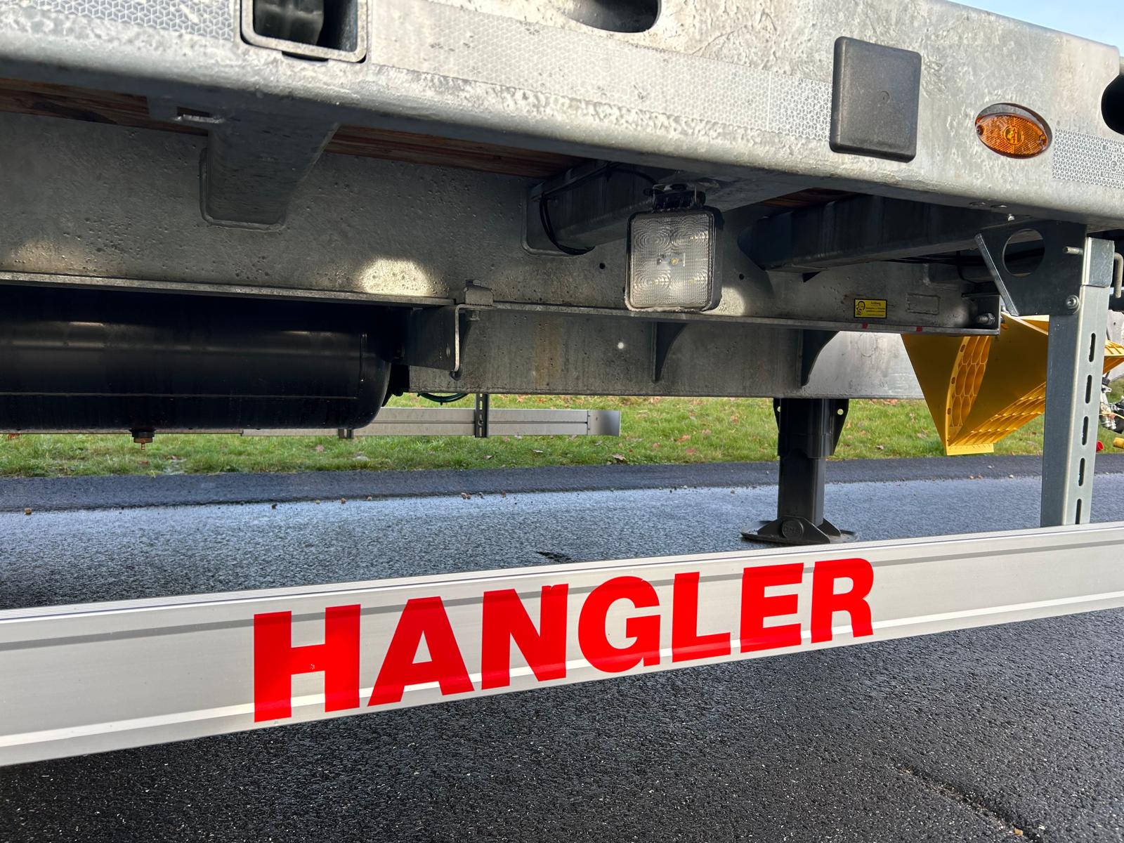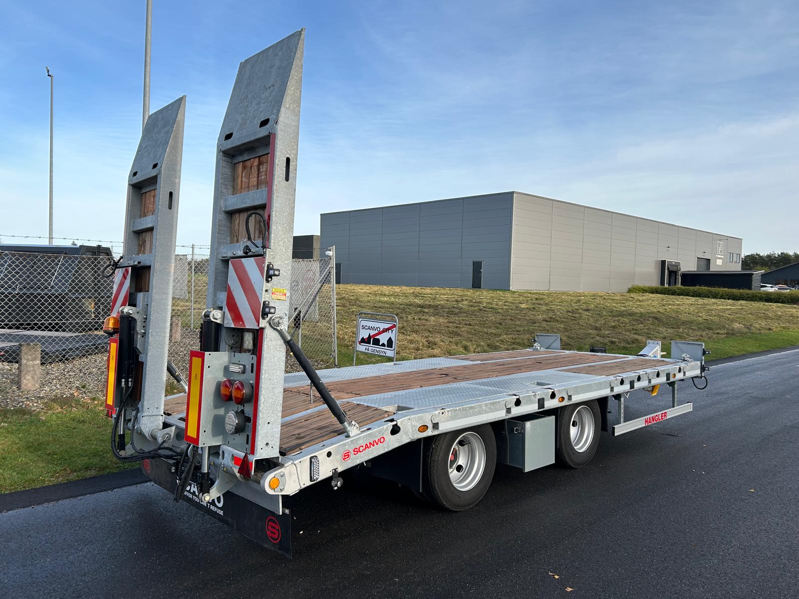 Fabriksny 2-aks Hangler 20-tons kærre med hydrauliske ramper og containerlåse.