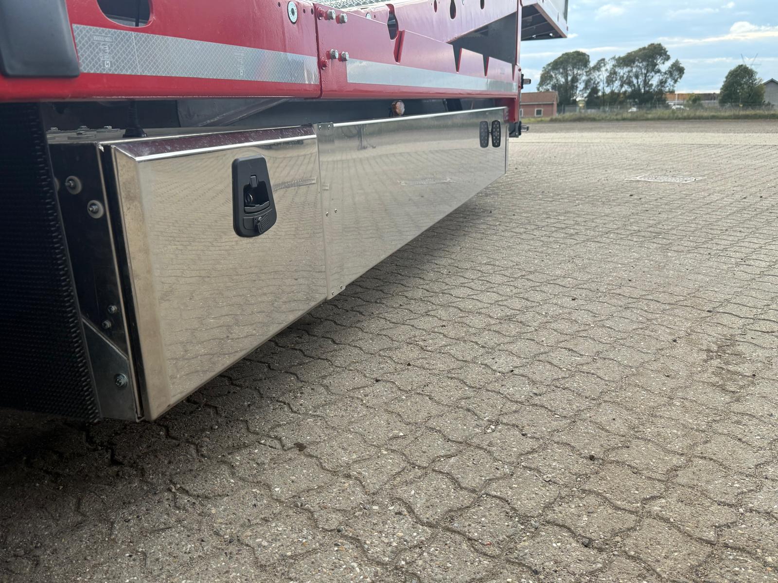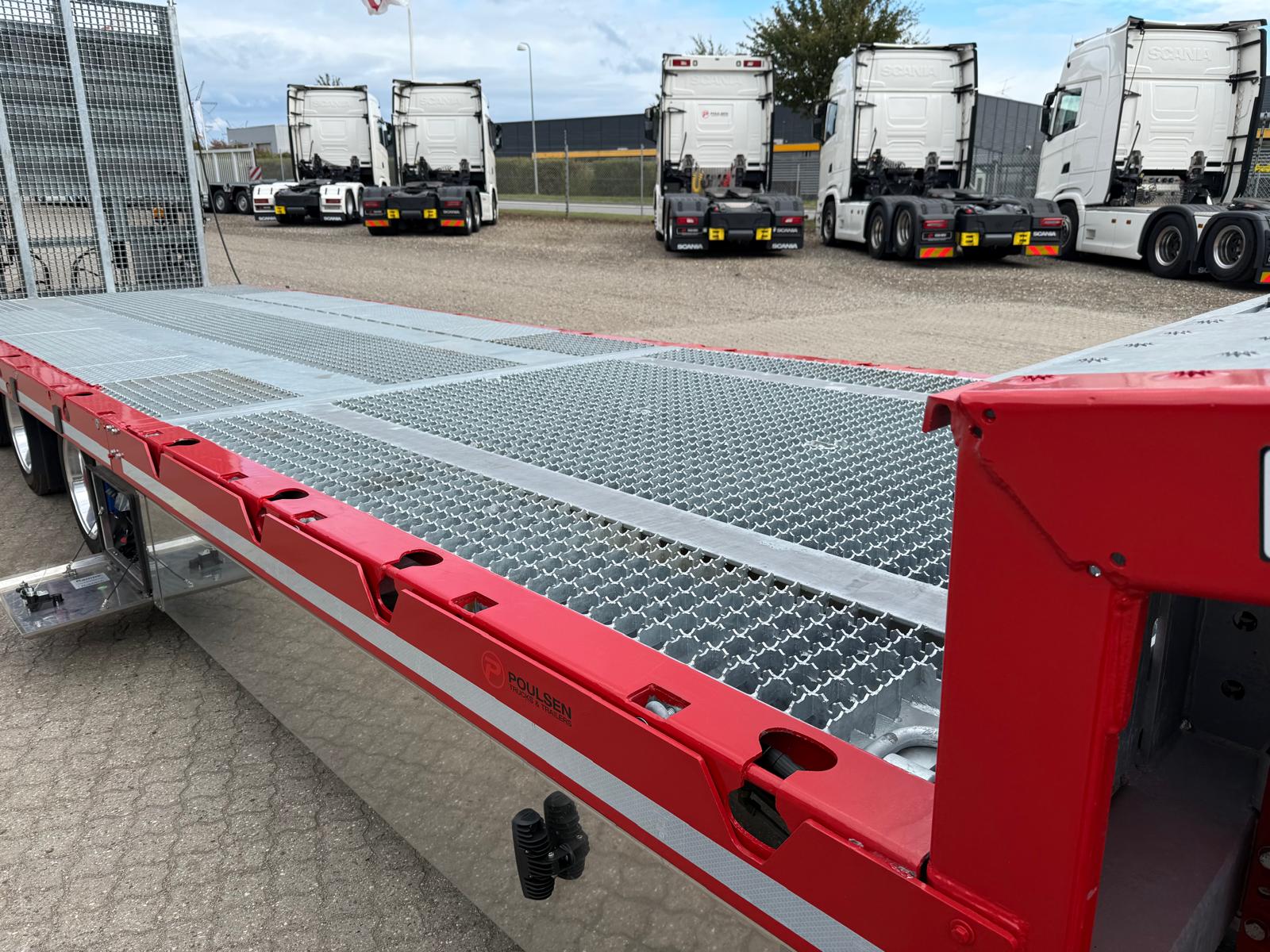 Traileren er desuden udstyret med forbredningsskilte for og bag, mange surringsmuligheder, sideskørter, værktøjsskabe samt en hydraulikstation. På rapoen findes et praktisk opbevaringsrum.