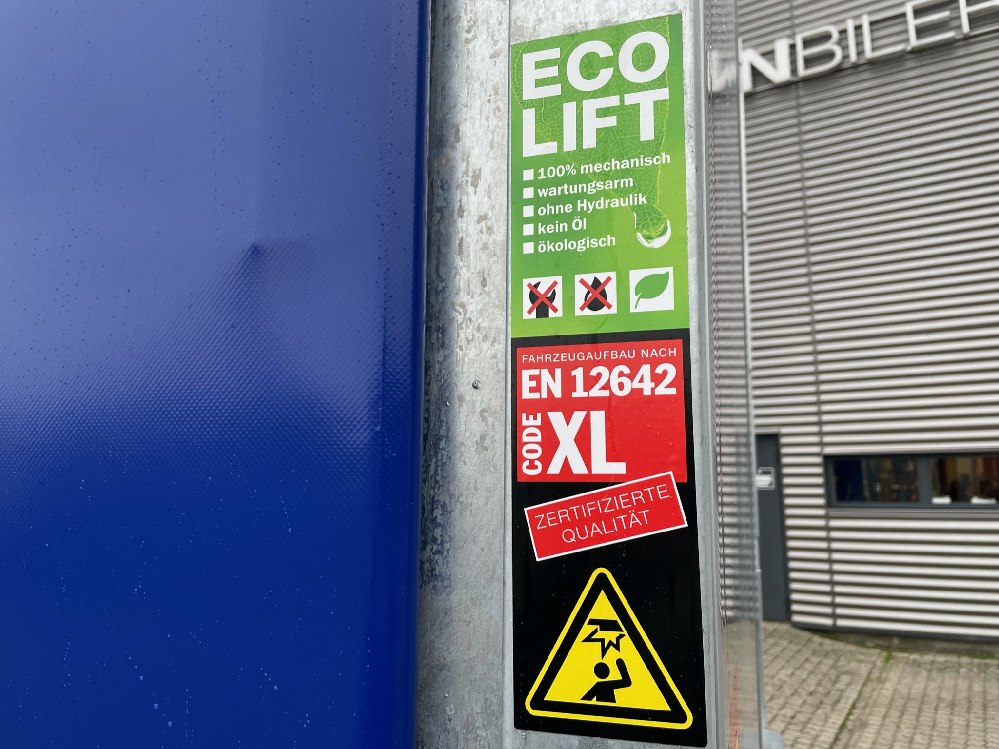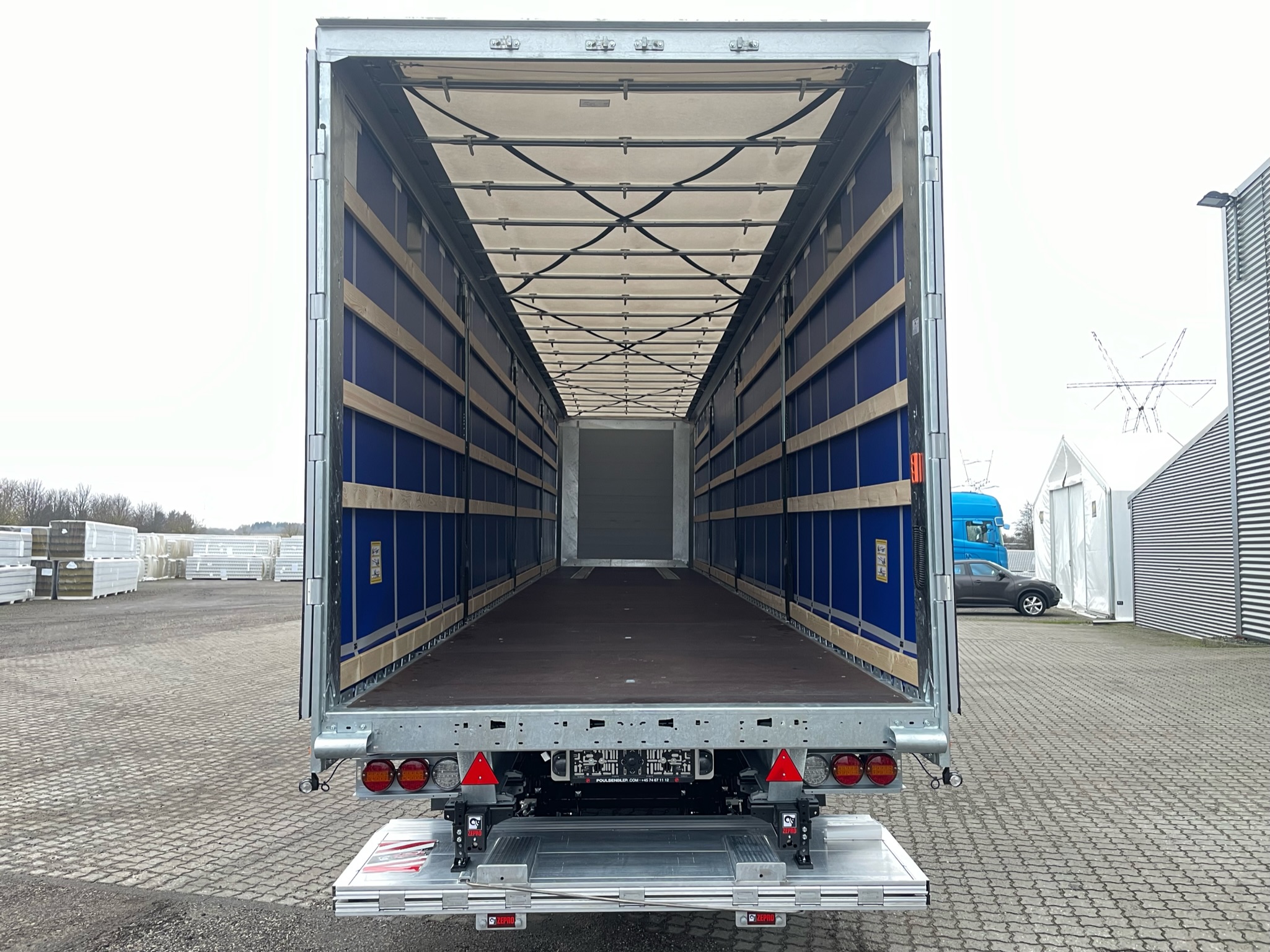 Sidehængte bagdøre - Gardinsider som er XL godkendt (EN 12642 Code XL) - Ecolift hævetag ca. 380 mm - Skydetag (Åbnes bagfra og skydes frem) - Finer træ bund - Galvaniseret kæpstokke - Kæpstokkehuller langs siderne + midten.